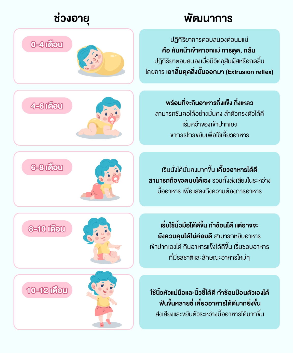 ทารกจะมีความพร้อมในการกินอาหารกึ่งแข็งกึ่งเหลว สามารถชันคอได้อย่างมั่นคง มีการทรงตัวที่ดีขึ้น ใช้มือคว้าของเอาเข้าปากได้ extrusion reflex เริ่มหายไป ใช้ขากรรไกรในการบดเคี้ยว