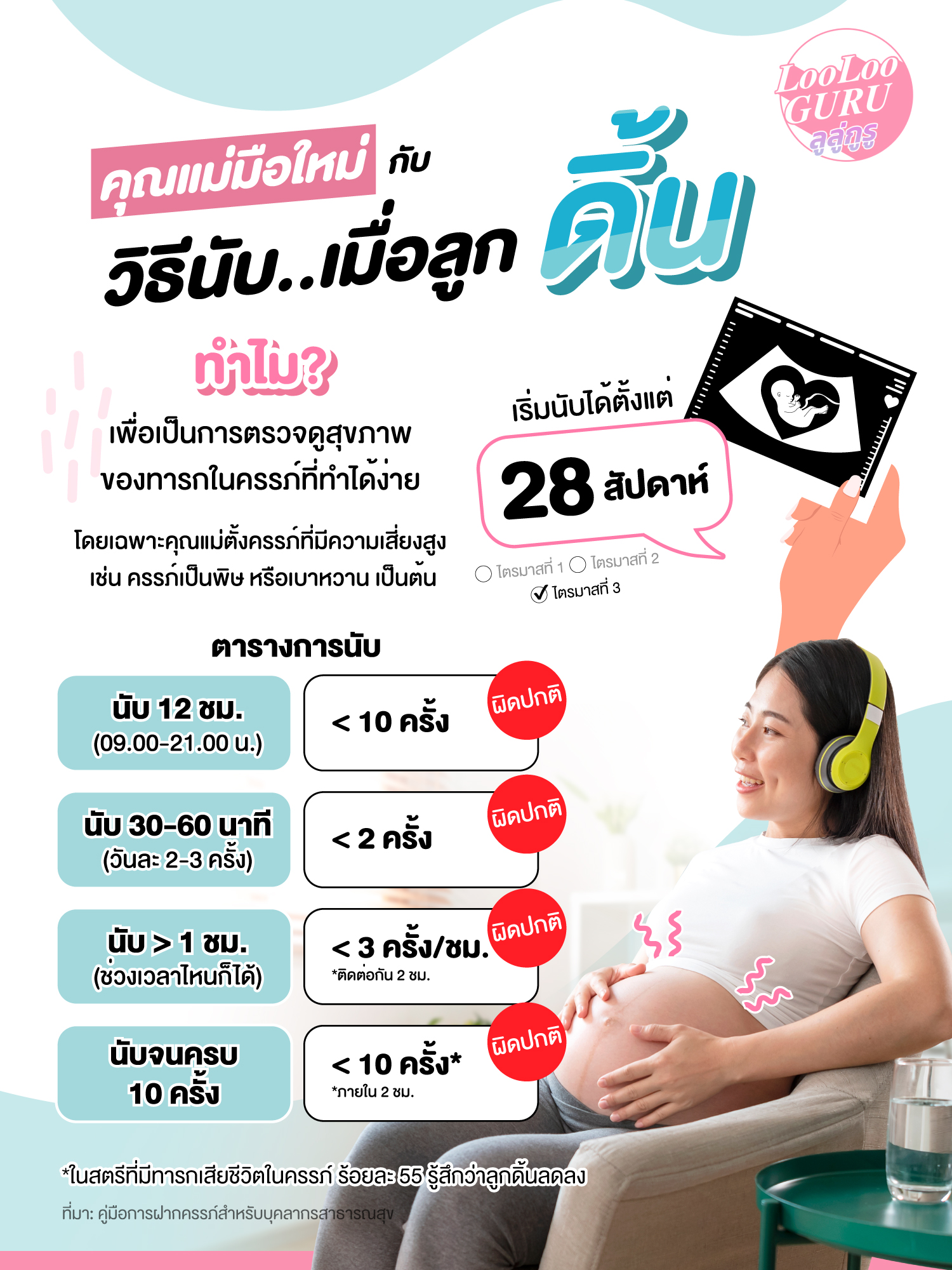 คุณหมอมักจะแนะนำให้เริ่มนับลูกดิ้นตั้งแต่อายุครรภ์ 28 สัปดาห์เป็นต้นไป โดยวิธีการนับก็มีหลายวิธีค่ะ ซึ่งแตกต่างกันทั้งจำนวนครั้งของการดิ้น และระยะเวลาที่ใช้นับ ลูลู่ กูรูวันนี้จึงรวบรวมวิธีการนับแต่ละวิธีมาส่งต่อให้คุณแม่ทุกๆ ท่านค่ะ