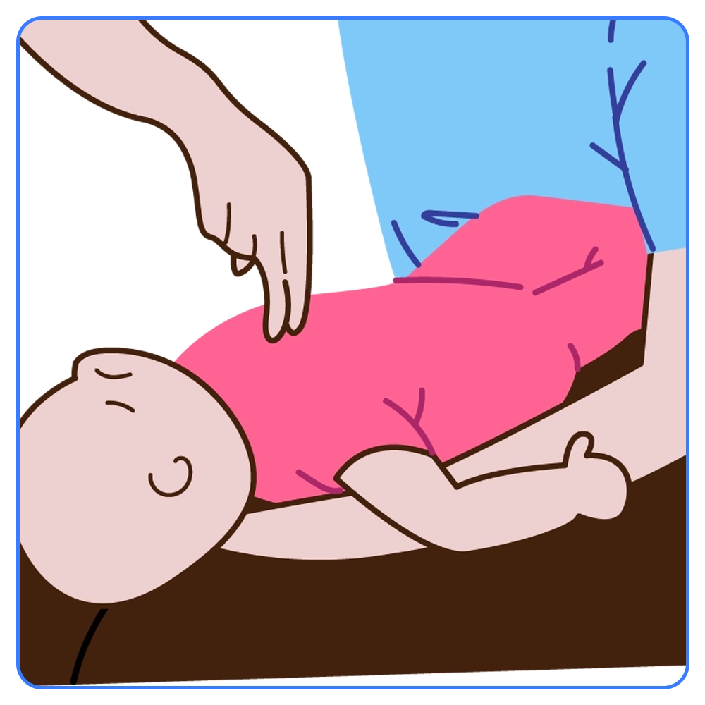 - อุ้มลูกน้อยในท่านอนคว่ำ ตบหลังเบาๆ 5 ครั้ง ตรงกึ่งกลางระหว่างสะบัก โดยใช้สันมือ